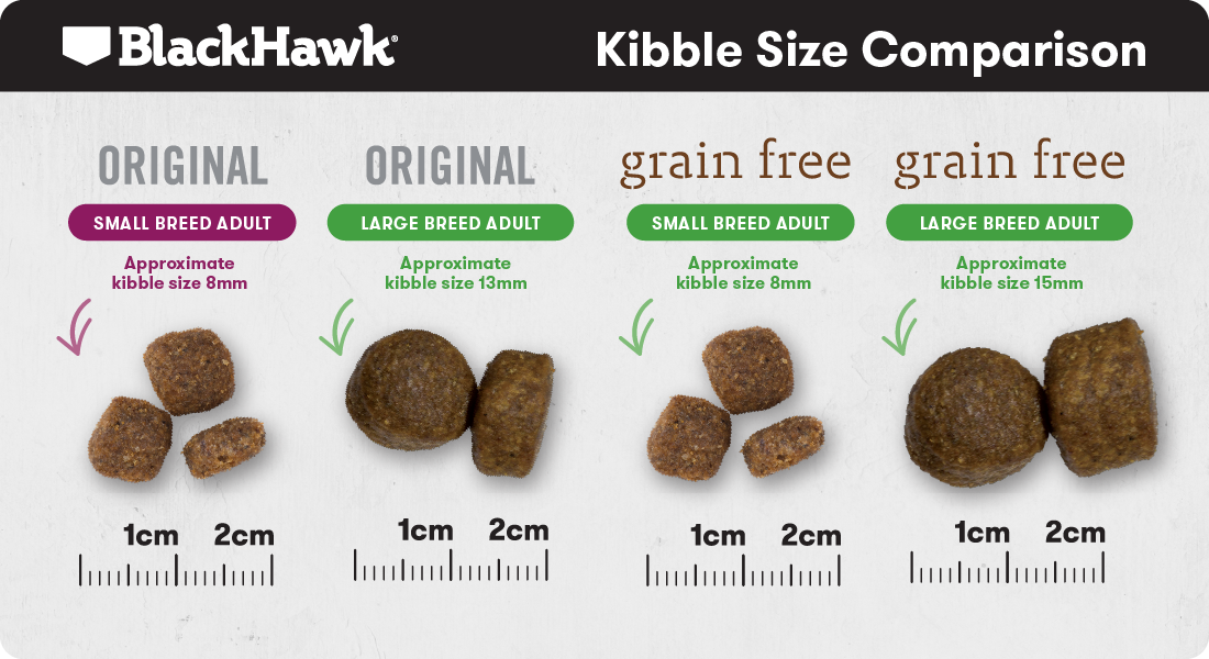 Black Hawk’s Large Breed Grain Free Chicken and Large Breed Original Chicken & Rice feature larger kibble designed to: