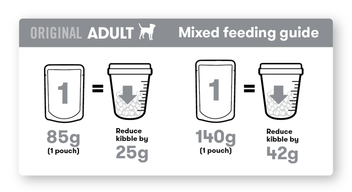 If using 85g pouches, for each pouch per day we recommend reducing the amount of dry food per day by 25g.